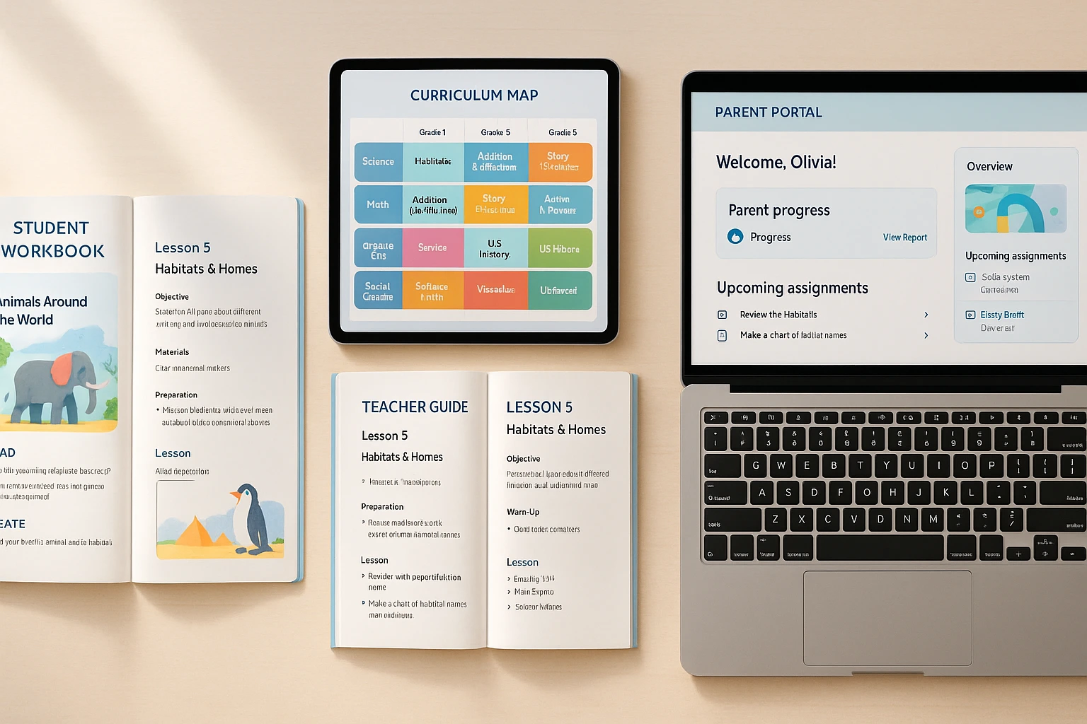 We don’t just hand over PDFs. We design entire academic experiences that can be deployed at scale — nationally, district-wide, or inside a single private school group that wants to differentiate.